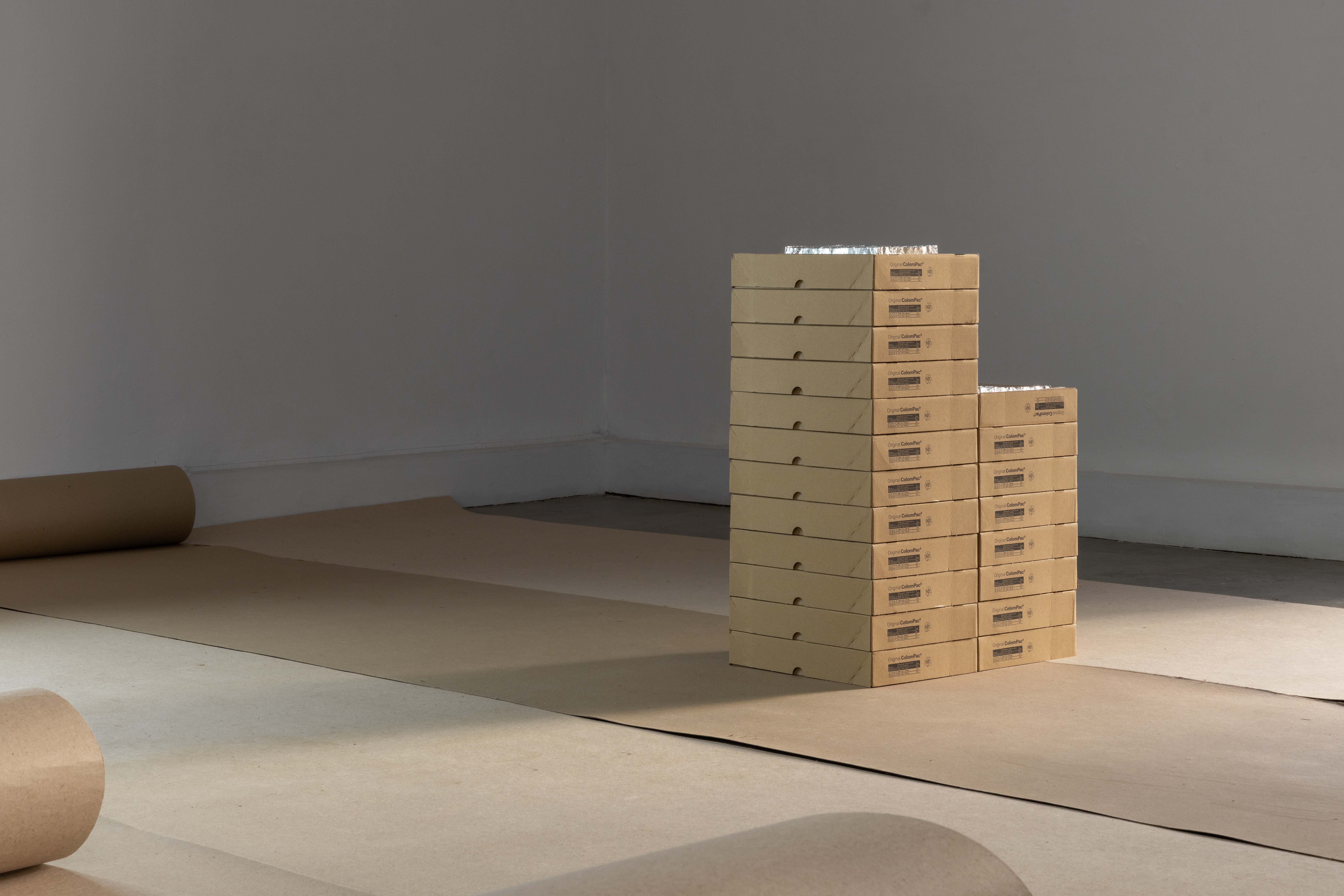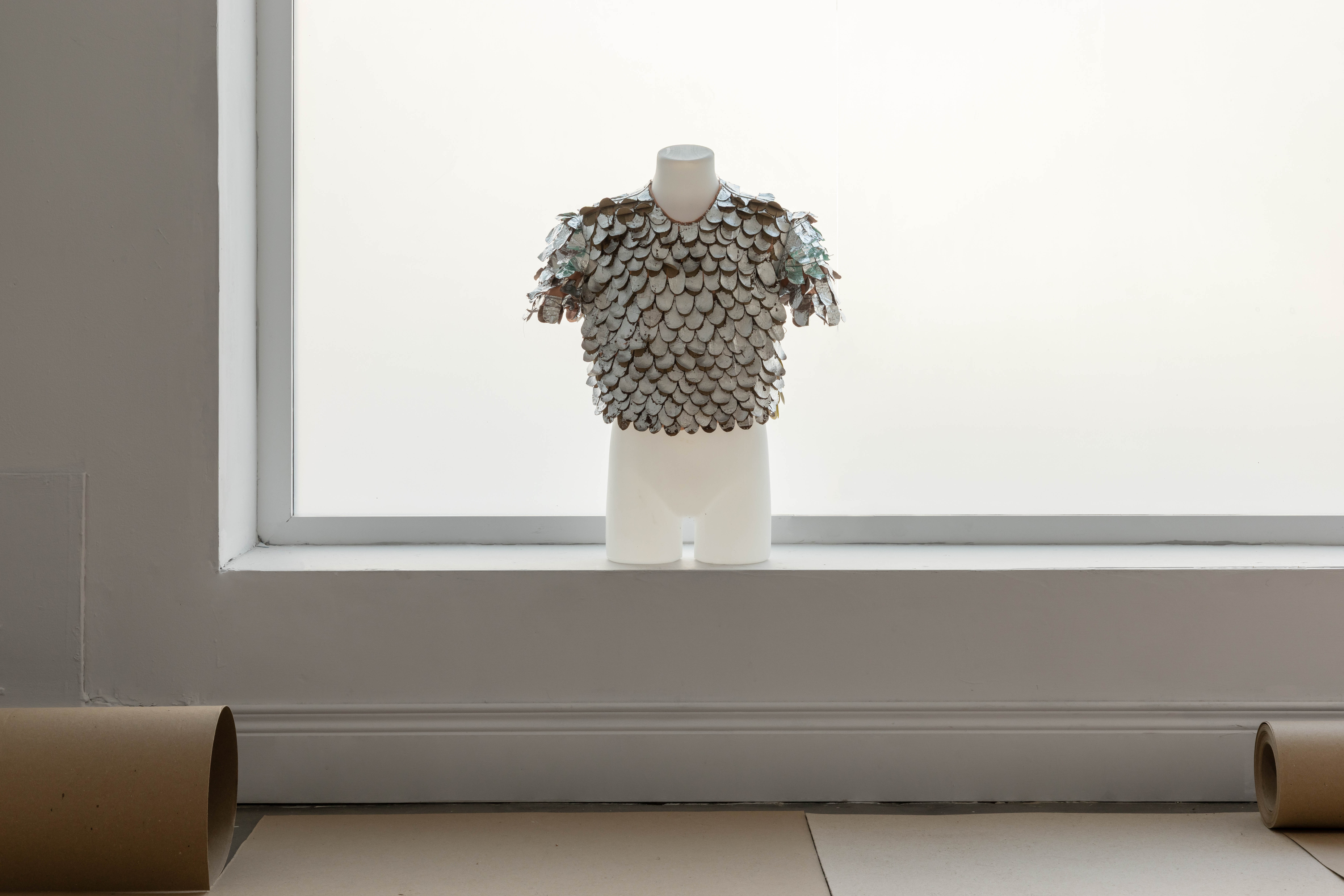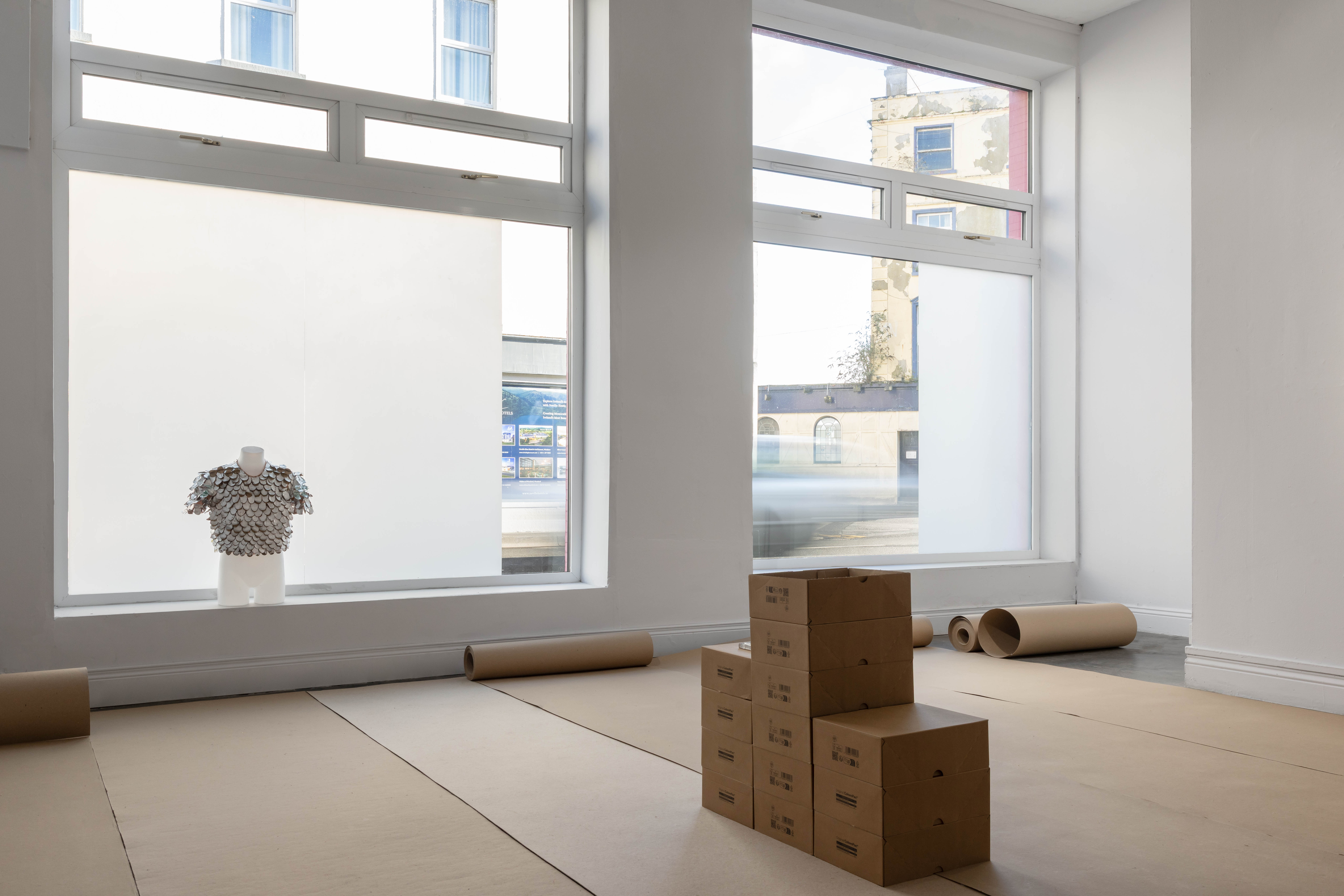Materials: polyethylene child mannequin, leather, silver leaf, foil emergency blanket, cotton bed-sheet, thread, x-ray illuminator, acetate, digital print on transparent vinyl, footstool, hard-surface floor protector, cardboard boxes, disposable aluminium plating, double sided tape