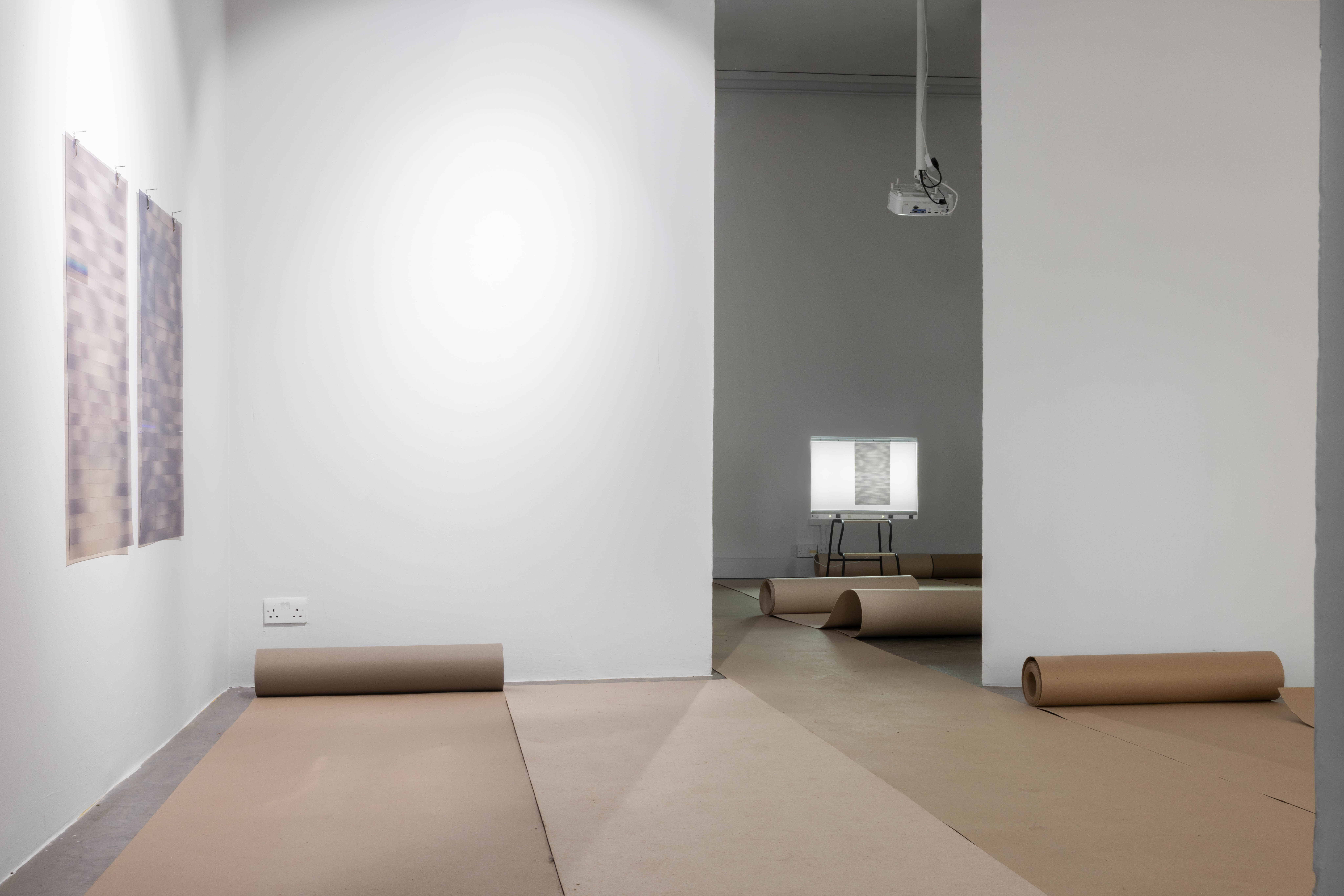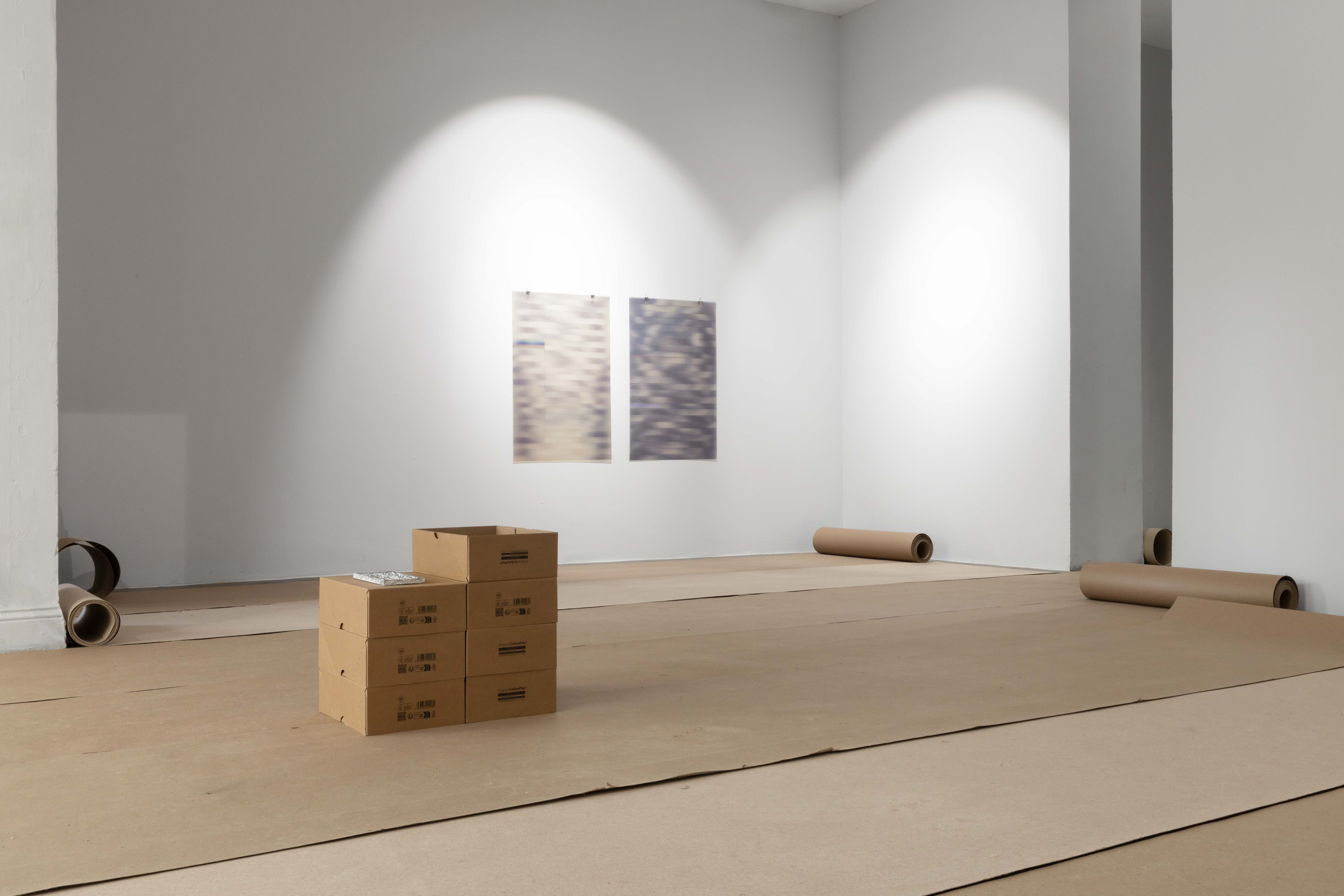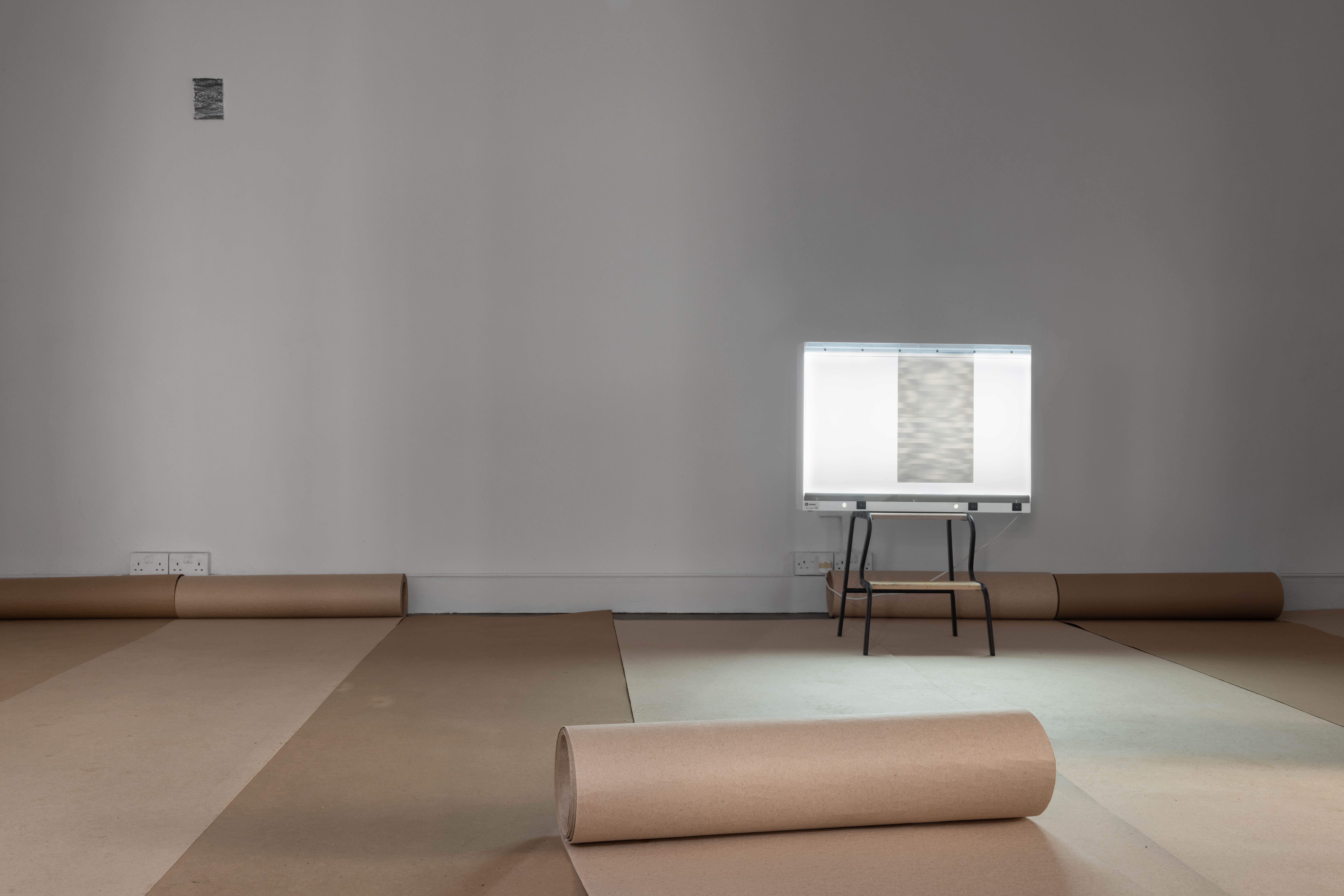Materials: polyethylene child mannequin, leather, silver leaf, foil emergency blanket, cotton bed-sheet, thread, x-ray illuminator, acetate, digital print on transparent vinyl, footstool, hard-surface floor protector, cardboard boxes, disposable aluminium plating, double sided tape